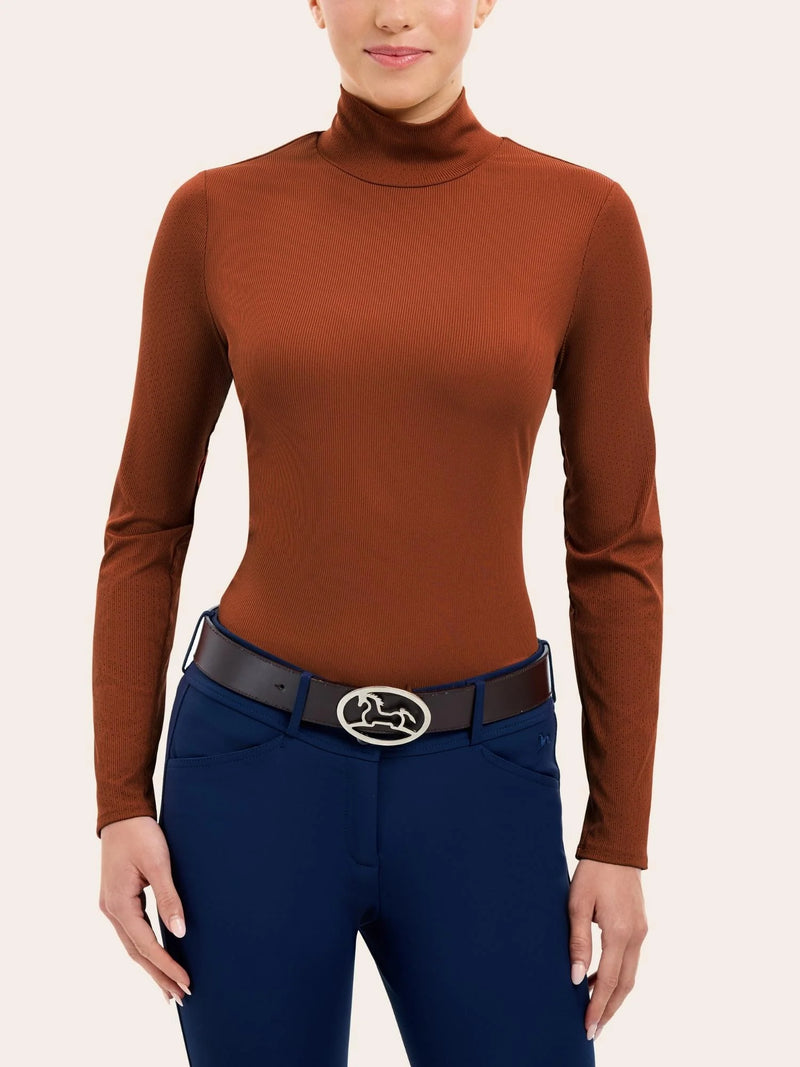 Stay chic and cool in the saddle with the RJ Classics Joelle Mock Neck Shirt — where fashion meets function. Crafted from a luxurious ribbed fabric, this schooling top delivers a stretchy, quick‑dry performance that keeps up with your every move. Perforated collar and sleeves boost airflow for comfort even during intense training sessions. With UPF 30+ sun protection, you’re shielded when the sun’s on full display. The athletic fit flatters without constricting, while subtle logo detail adds sophistication. Ideal for schooling or casual wear around the barn, this shirt is a versatile staple for your equestrian wardrobe. The Joelle Mock Neck is the perfect choice to stay on trend this season.